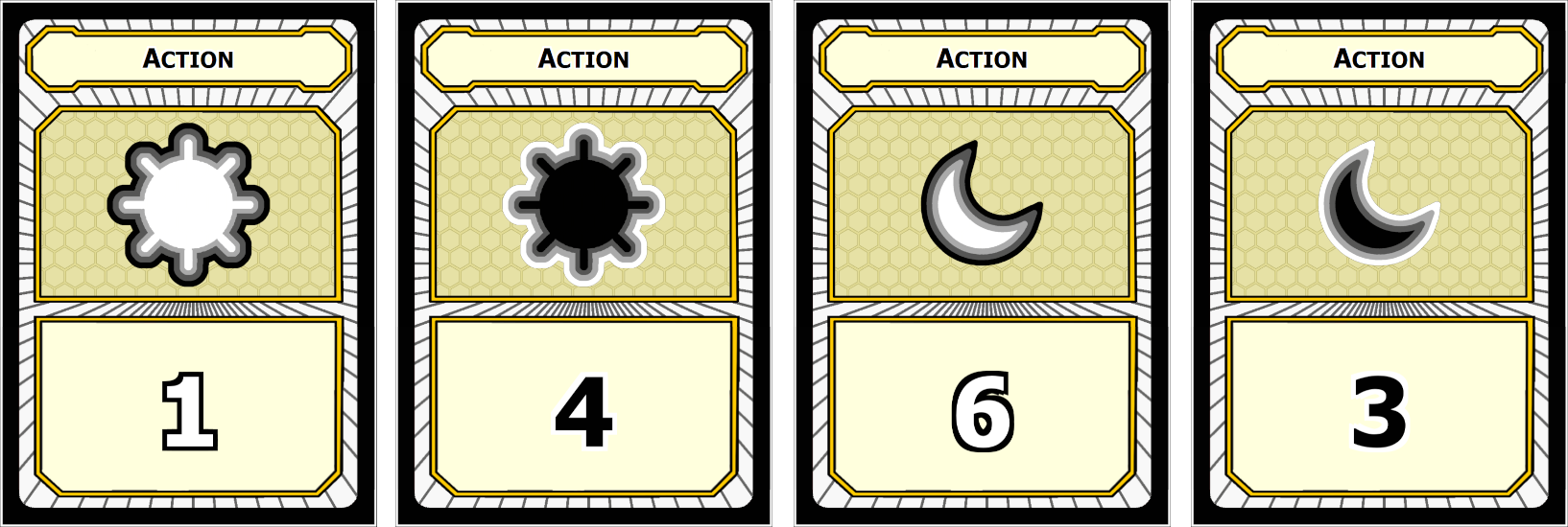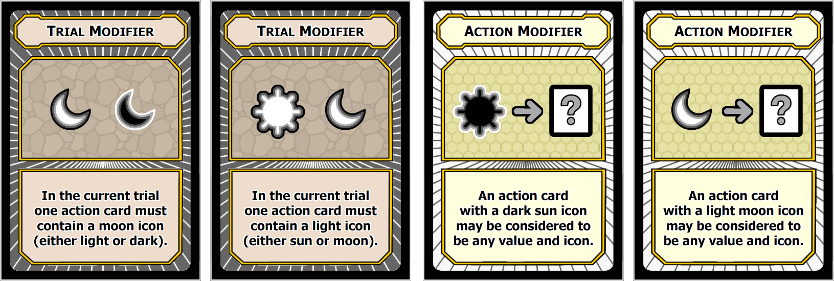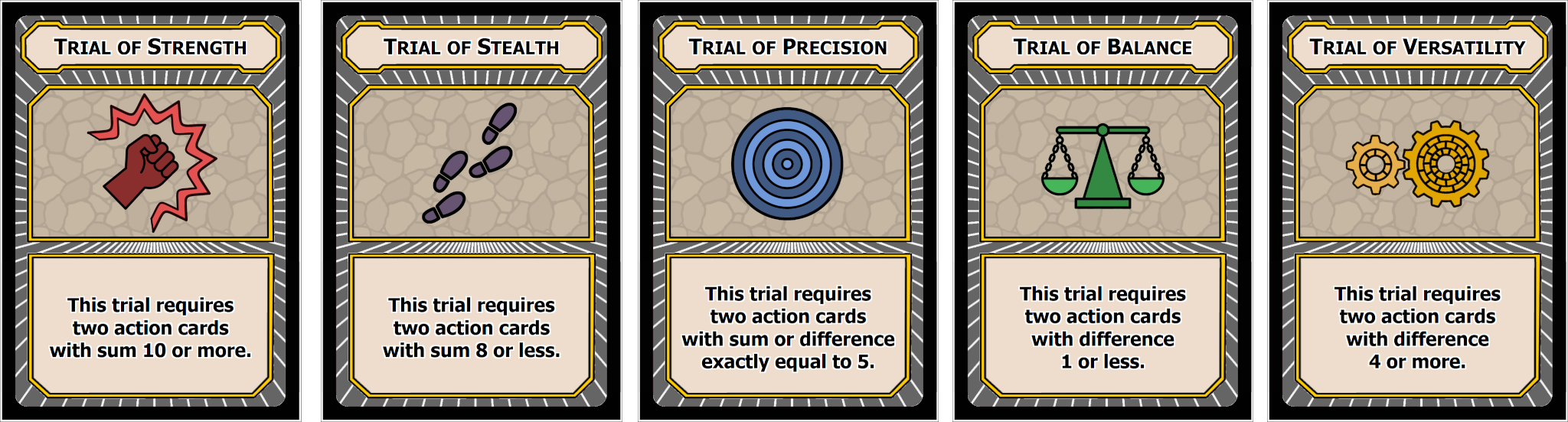 Each trial is defeated by playing a pair of action cards that meet varying conditions.